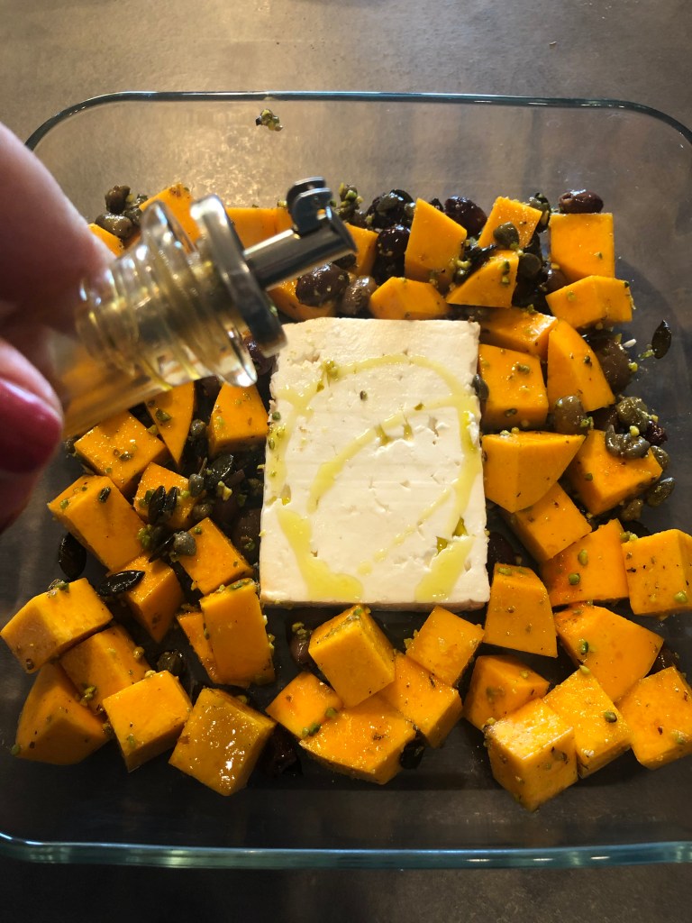 Appoggio la feta in una pirofila e distribuisco la zucca tutto intorno, poco olio