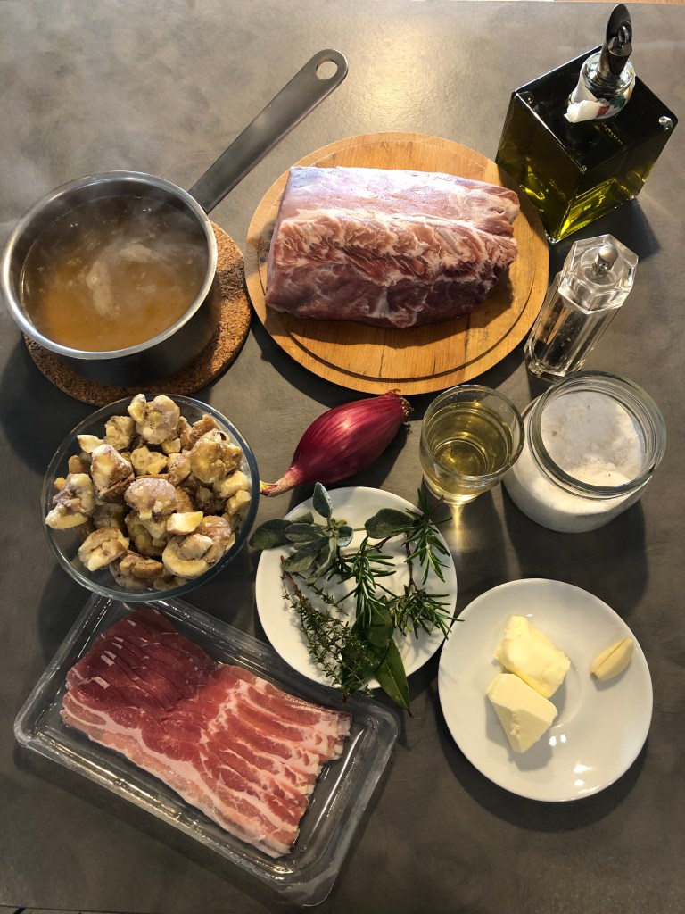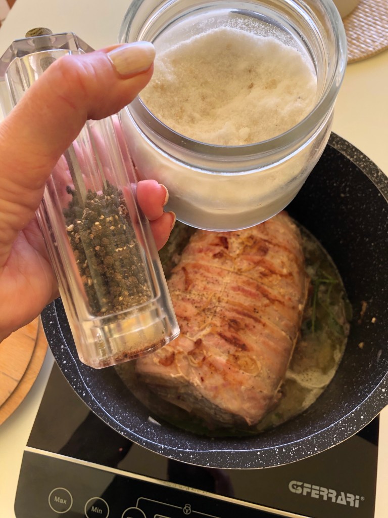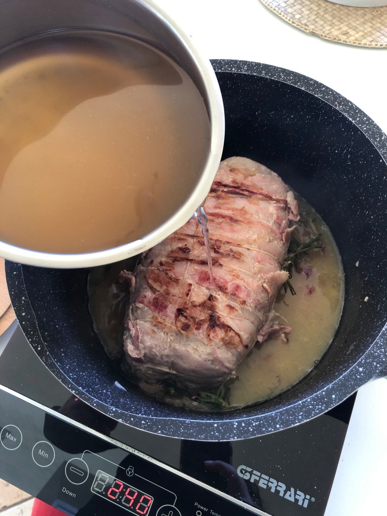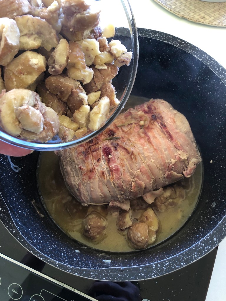 Dopo 30 minuti aggiungo le castagne precedentemente bollite e sbucciate elimino le erbe aromatiche e cuocio ancora una mezz’ora, se avete una sonda misurate la temperatura al cuore 63/65 gradi al cuore, se serve aggiungete brodo,