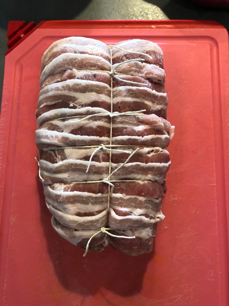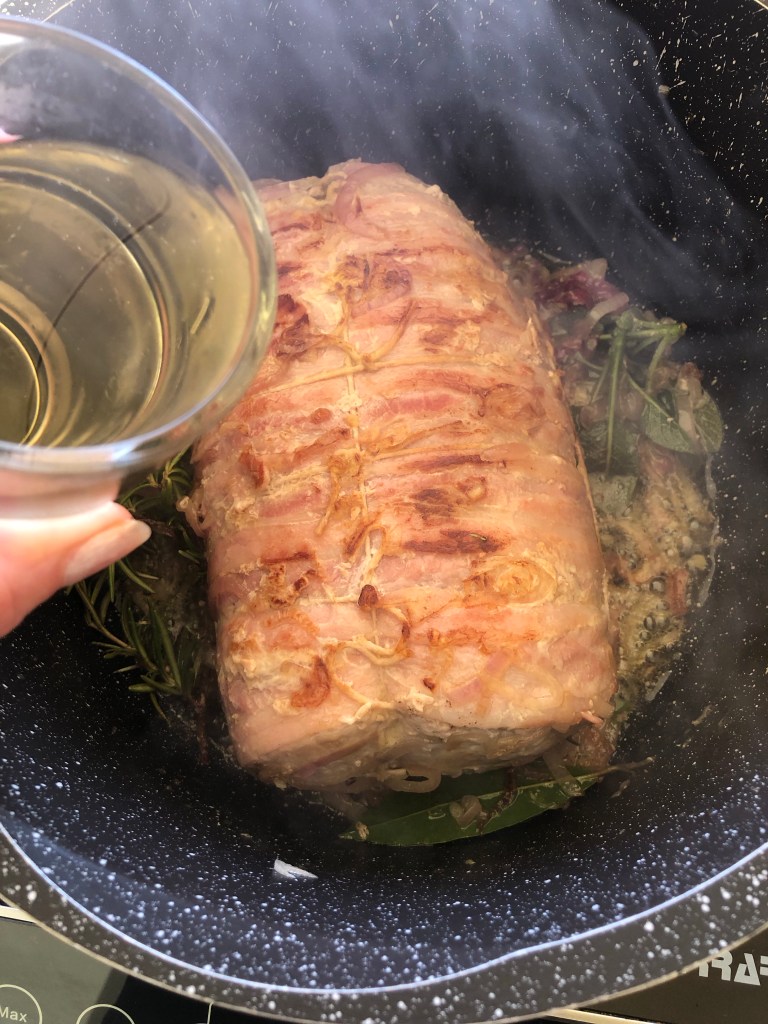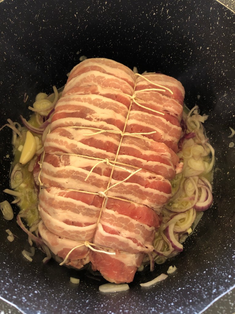 Avvolgo la lonza con il bacon e lego bene con spago da cucina