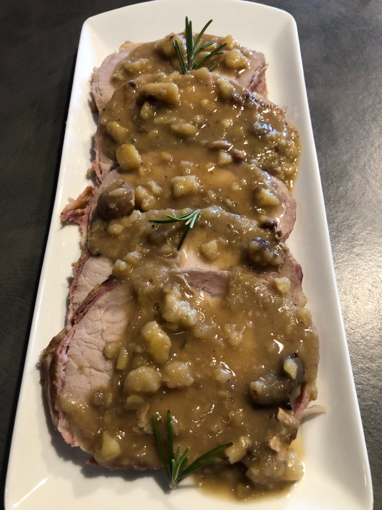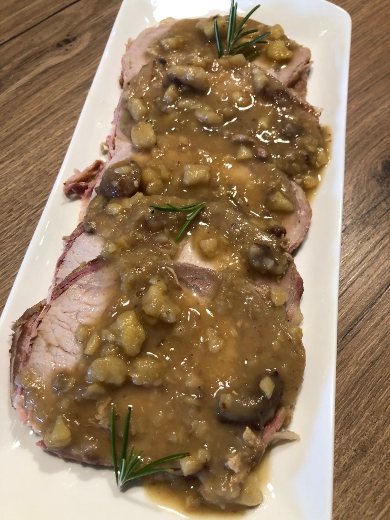 Un buonissimo arrosto adatto al periodo invernale, se amate le castagne questo é il piatto perfetto una buona idea per le feste in arrivo, io lo preparo il giorno prima e lo preparo già affettato ricoperto dal sugo in questo modo la carne assorbirà tutti i profumi e sapori diventando morbidissima, sarà sufficiente solo riscaldarlo al momento dell’utilizzo e avrete più tempo per dedicarvi ad altro ad esempio un buonissimo dolce
