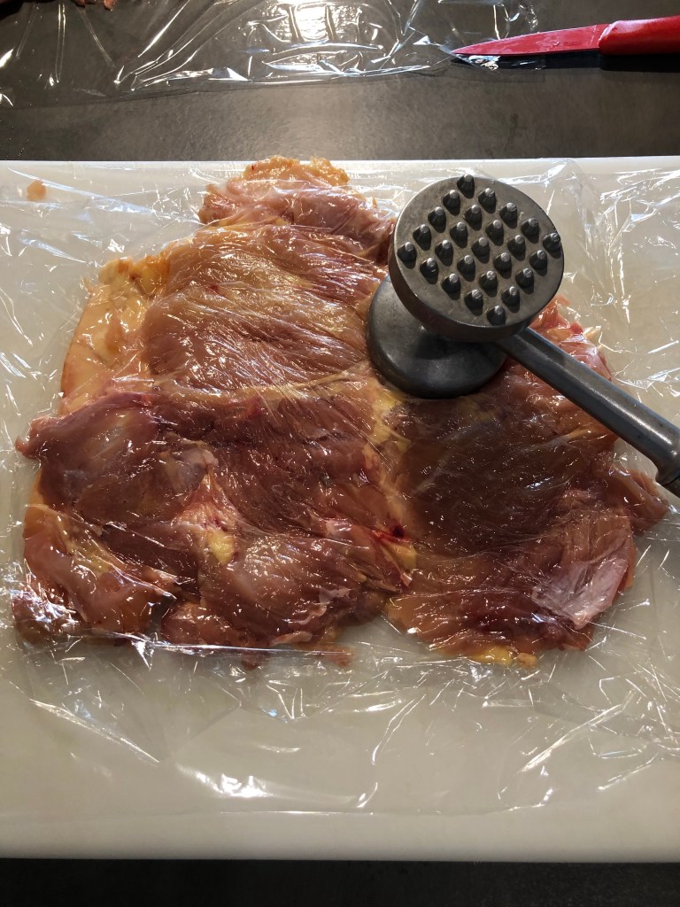 Appoggio la carne su un foglio di pellicola e copro con un altro, batto per uniformare la carne