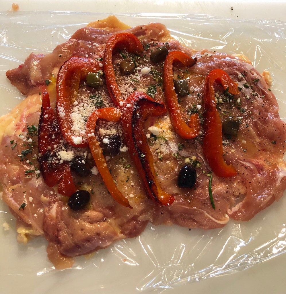In una padella con un goccio di olio e uno spicchio di aglio salto velocemente il peperone rosso lavato, pulito e tagliato a spicchi, aggiungo poco sale, lo suddivido sulla carne aggiungendo le olive e un cucchiaio di parmigiano grattugiato