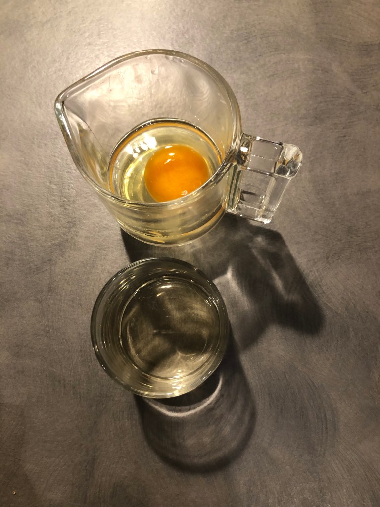 Rompo l’uovo in un bricco o ciotola, preparo 1 cucchiaio di aceto