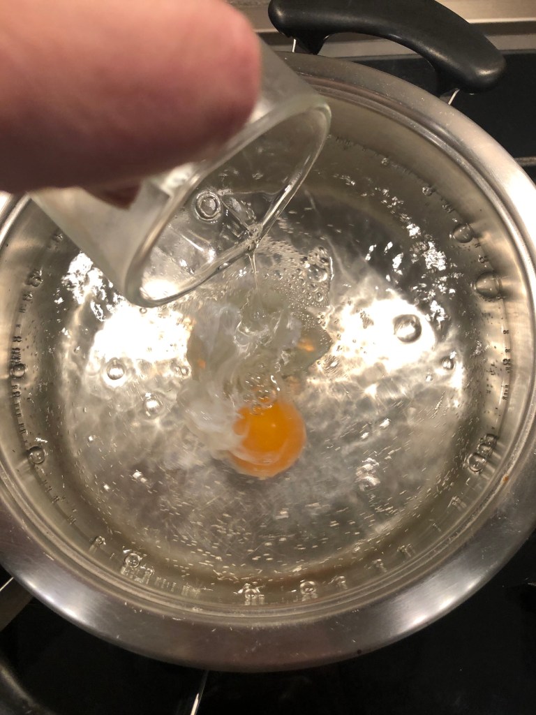 Porto quasi a bollore un pentolino con acqua, verso l’aceto e con un cucchiaio giro fino a creare un vortice, verso l’uovo e lascio cuocere per circa 4 minuti, con una schiumaiola tolgo l’uovo, lo appoggio delicatamente su carta assorbente