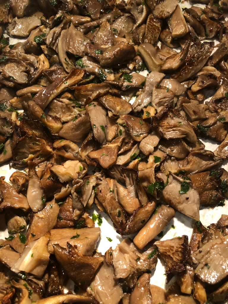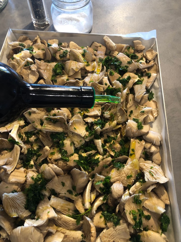 Rivesto una grande teglia con carta forno, meglio distribuirli in un solo strato, la ungo di olio extravergine, sistemo i funghi tagliati in pezzi grossolani, aggiungo un trito di prezzemolo con uno spicchio di aglio, sale e pepe