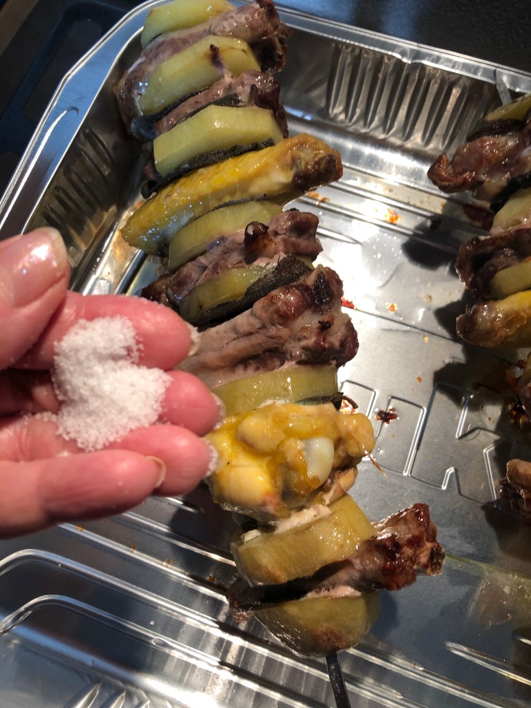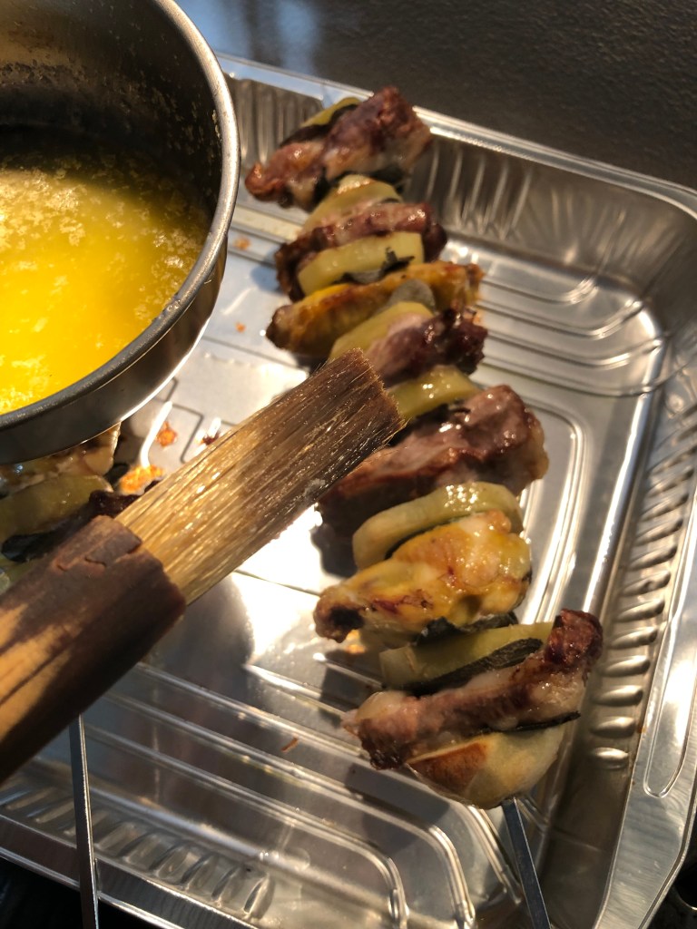 Sciolgo un bel pezzo di burro in un pentolino prendo una teglia usa e getta di alluminio e appoggio gli spiedini sul bordo tenendoli sollevati, inforno a 170 gradi per mezz’ora senza condimento, dopo 15 minuti faccio roteare gli spiedini, dopo mezz’ora li tolgo dal forno e ungo di burro fuso con un pennello
