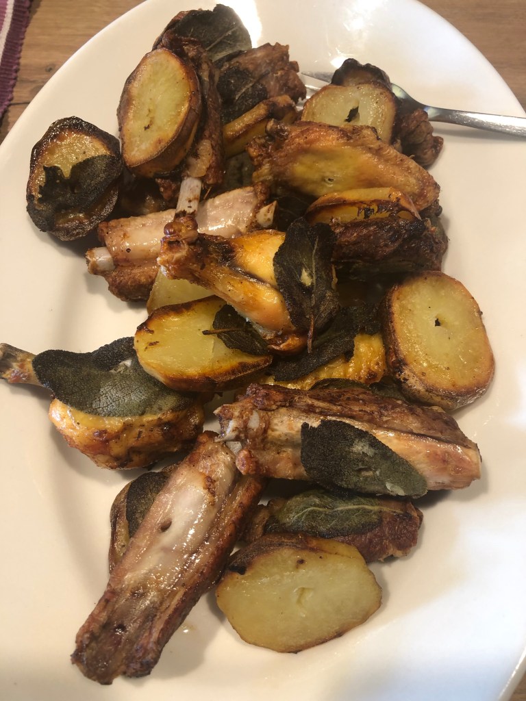 Avevo voglia di spiedo, ma di solito mio fratello Marco é l‘esperto, io non lo so fare e non ho neppure l’attrezzatura per prepararlo, quindi preferisco farmi invitare, ho quindi preparato un simil spiedo, ma devo dire che era buonissimo e lo ricordava molto, si può aggiungere anche coniglio e altre parti del pollo, vi assicuro che il risultato non é niente male, ci vuole solo un po’ di pazienza e girarlo frequentemente