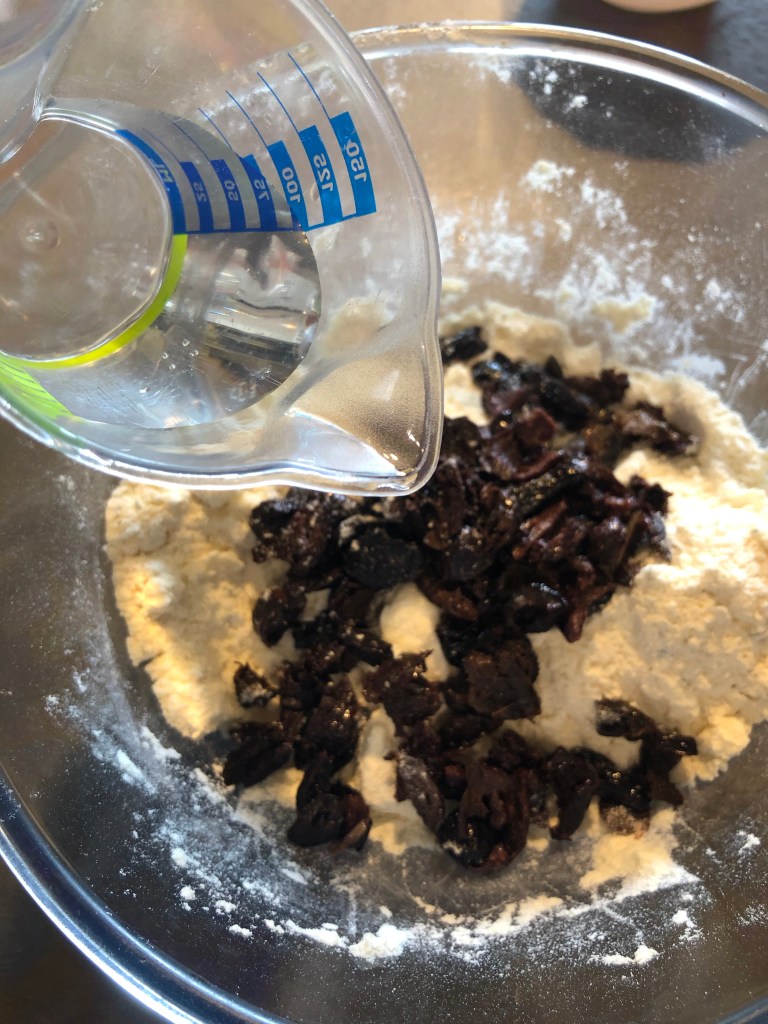 Unisco le olive che ho tagliato a pezzettini, potete utilizzare quelle denocciolate oppure come ho fatto io quelle più saporite greche cotte al forno, aggiungo un cucchiaio di acqua per volta e impasto fino ad ottenere un impasto omogeneo
