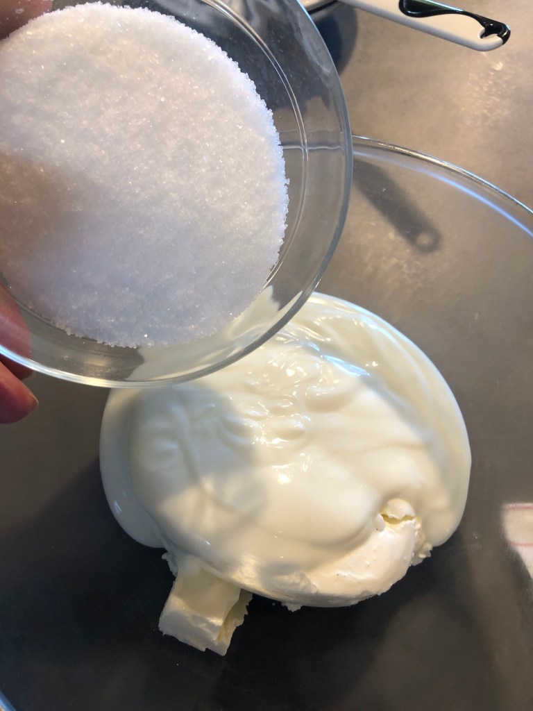 In una ciotola verso il formaggio Philadelphia, lo yogurt e lo zucchero e monto con le fruste elettriche