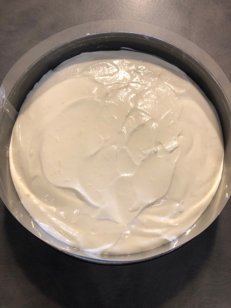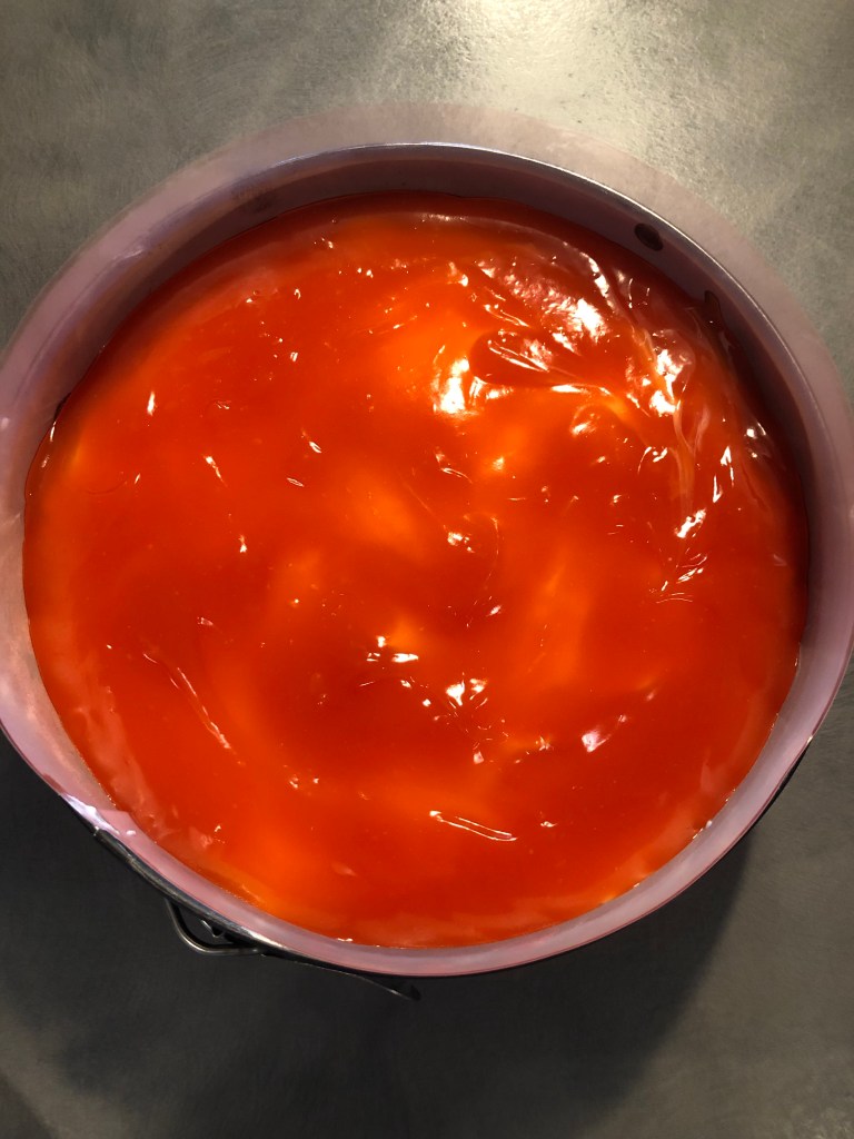 Verso la crema sulla base biscotto, livello bene e conservo in frigorifero aspettate almeno un’ora prima di versare la gelatina, la crema deve indurirsi altrimenti versando la gelatina sulla crema molle verrà un disastro