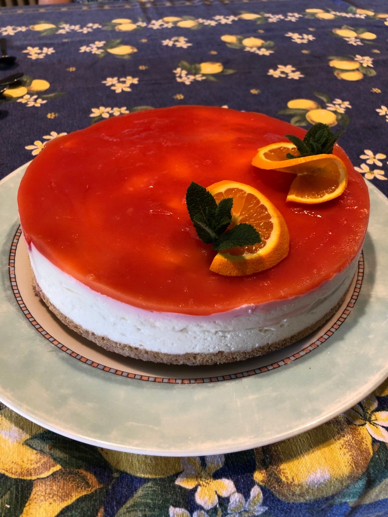 Ripongo in frigorifero per almeno 4 ore, poi la decoro con fettine di agrumi e ciuffetti di menta, si può congelare,decorandola al momento del consumo