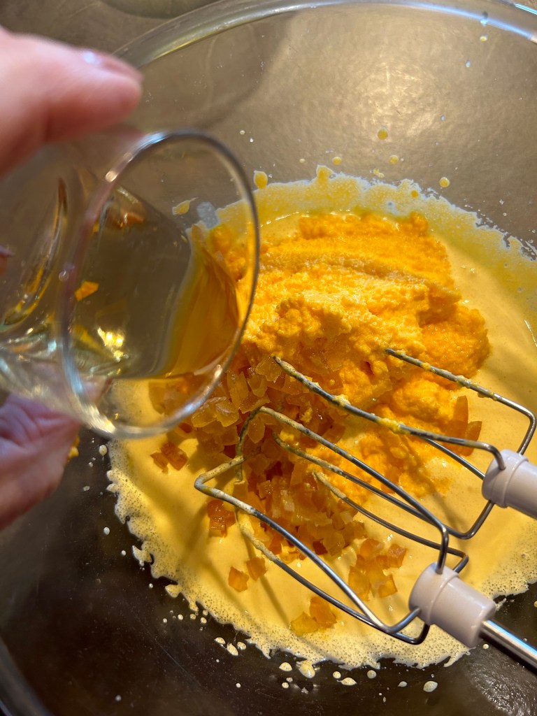 Aggiungo la polpa della zucca, l”arancia candita o la buccia grattugiata, il liquore all”arancia
