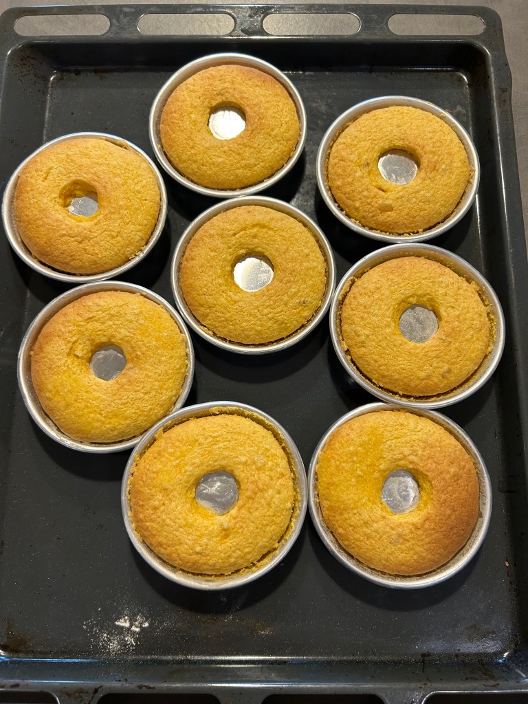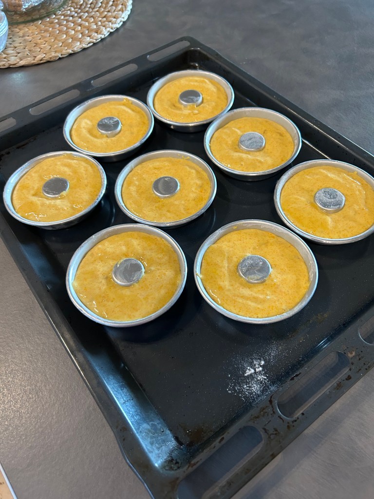 Suddivido il composto in 8 stampini a ciambella oliati e infarinati