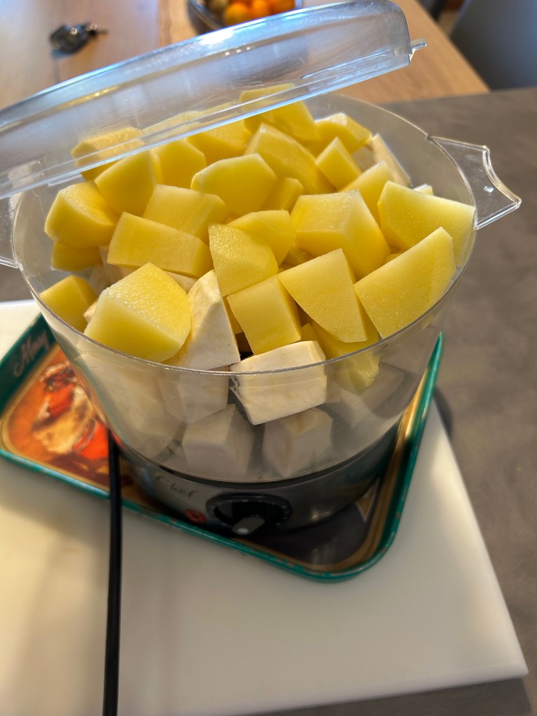 Metto in una vaporiera le verdure oppure a microonde o nella maniera classica e cuocio per circa 25 minuti