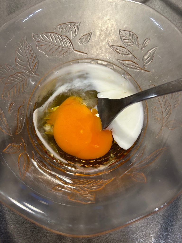 In una ciotola rompo l’uovo, aggiungo un cucchiaio di latte e lo batto con una forchetta, lo aggiungo al composto montato e continuo ancora per alcuni minuti
