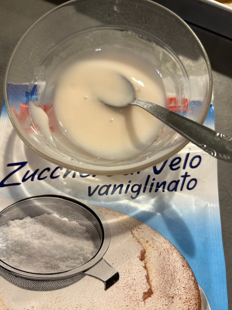 Adesso potete decorarli, io ho mescolato alcuni cucchiai di zucchero a velo con alcune gocce di limone, ho aggiunto pochissima acqua e mescolo, deve risultare una glassa densa, serve pochissima acqua, aggiungetela un cucchiaino per volta, se é liquida aggiungete ancora zucchero
