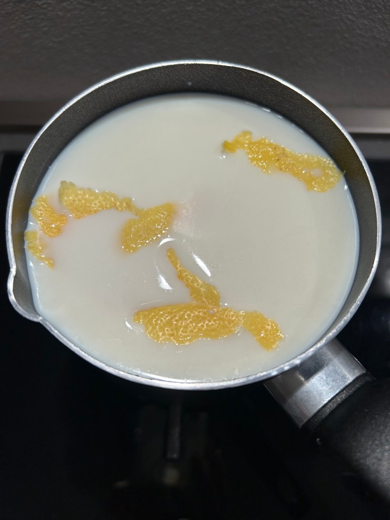 In un pentolino porto quasi a bollore il latte con la scorza del limone