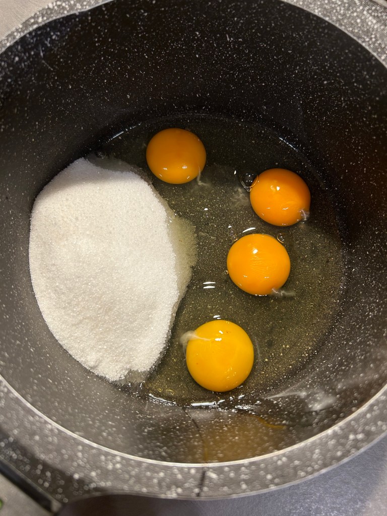 In un altro pentolino rompo le uova intere, aggiungo lo zucchero