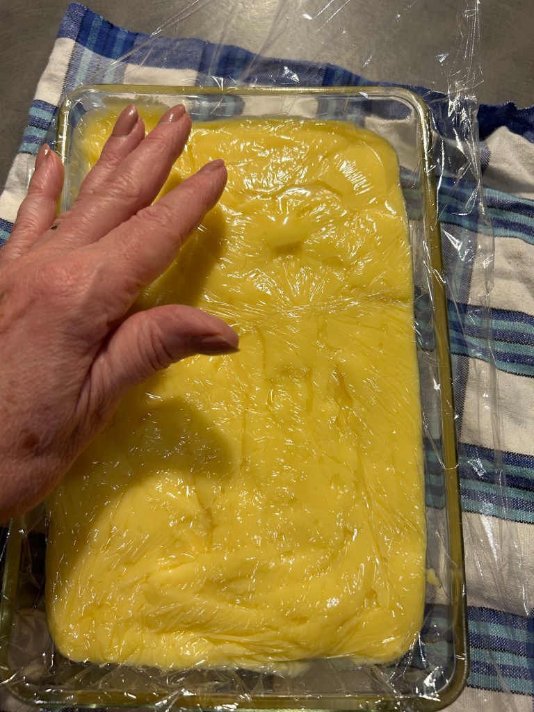 Verso subito in una pirofila fredda e metto una pellicola a contatto, conservo in frigorifero fino al momento dell’utilizzo