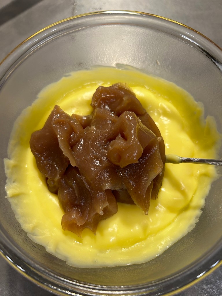 Trasferisco in una ciotola, lascio intiepidire e aggiungo la crema di marroni mescolando bene