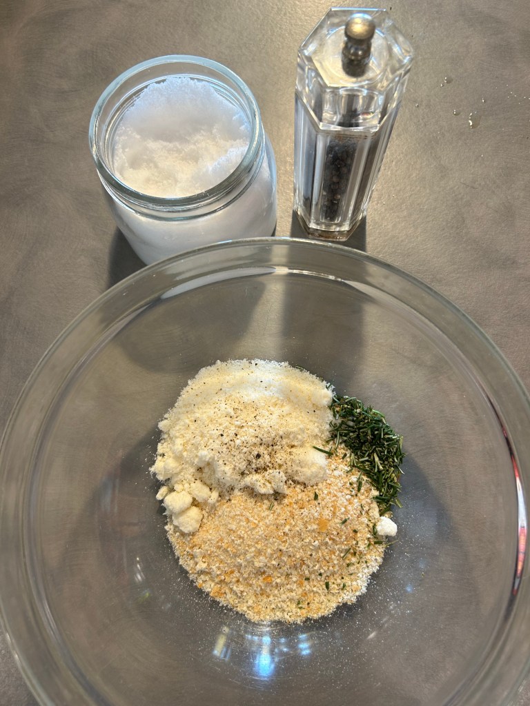 Mescolo il pane grattugiato con il parmigiano e il rosmarino