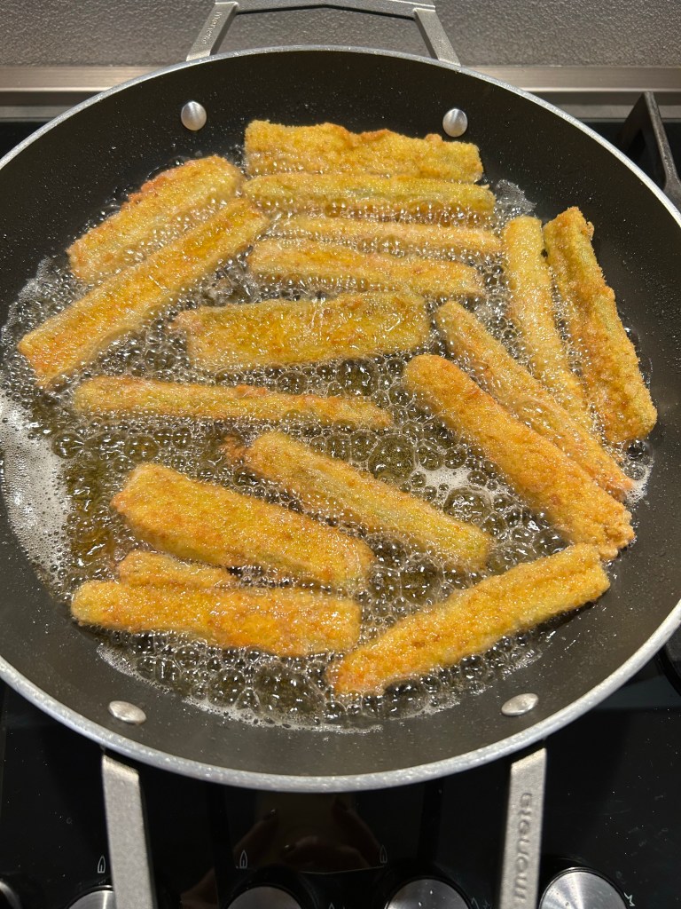 Metto dell’olio di semi di arachidi in una larga padella e lo scaldo quindi cuocio i cardi finché diventano dorati