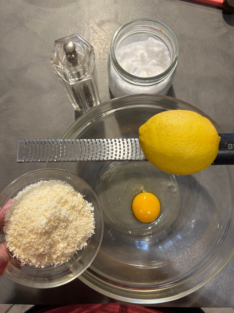 In una ciotola rompo l’uovo, aggiungo il parmigiano, sale, pepe e, la buccia di un limone biologico grattugiata