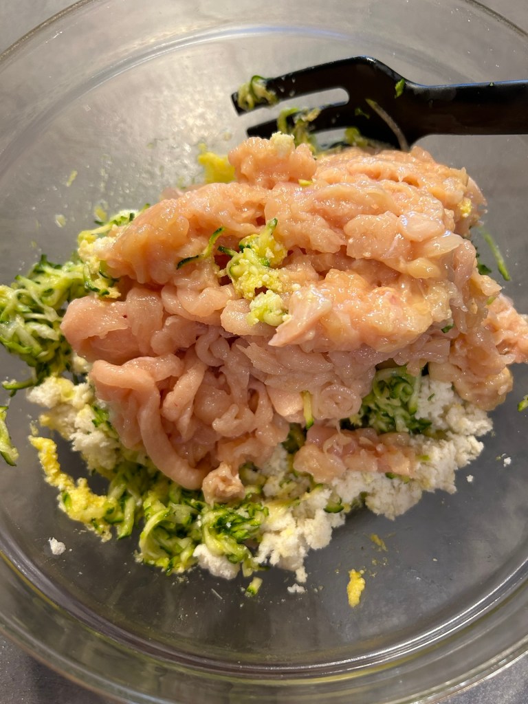 Unisco il petto di pollo che ho macinato e amalgamo bene