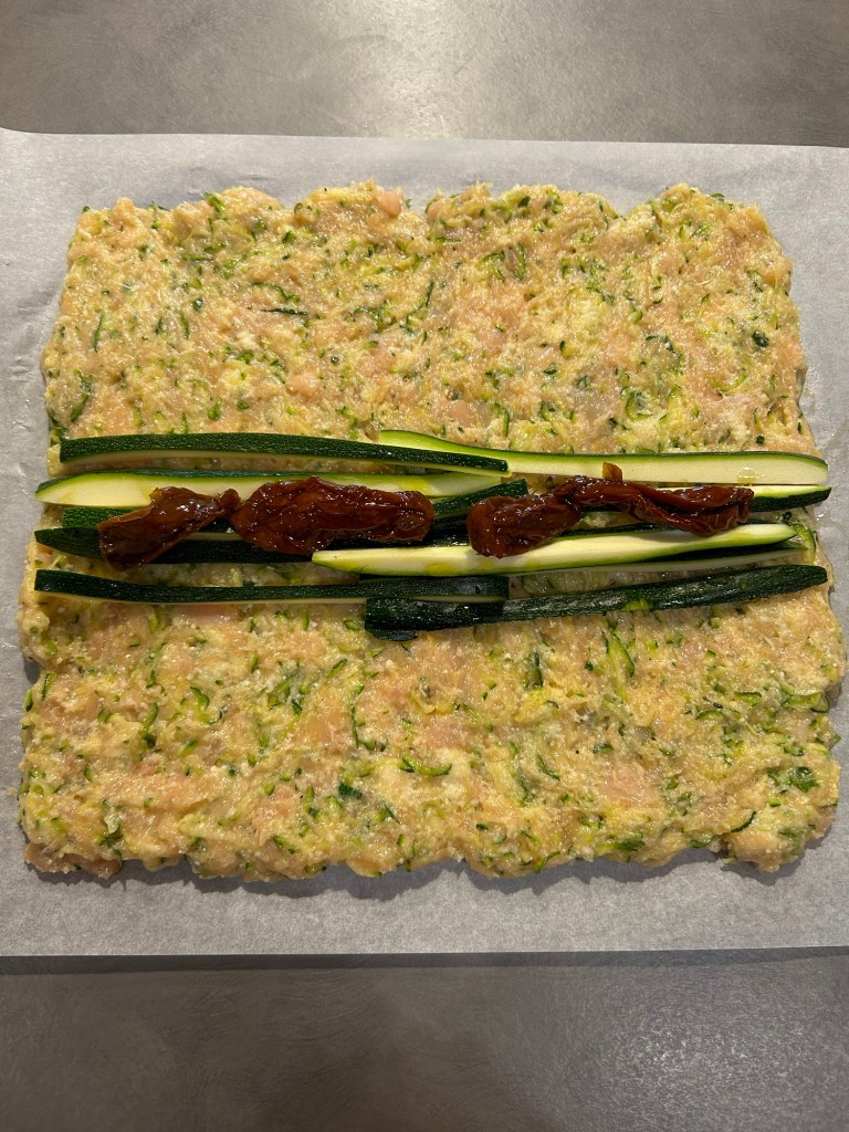 Al centro metto i bastoncini di zucchina, eliminate la parte bianca centrale troppo ricca di acqua e con poco sapore e aggiungo i pomodorini essiccati