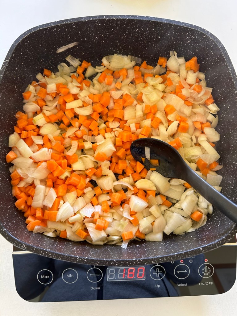 In una larga pentola che poi contenga l’arrosto verso abbondante olio, lo scaldo e aggiungo le verdure tritate, l’aglio e lascio appassire leggermente