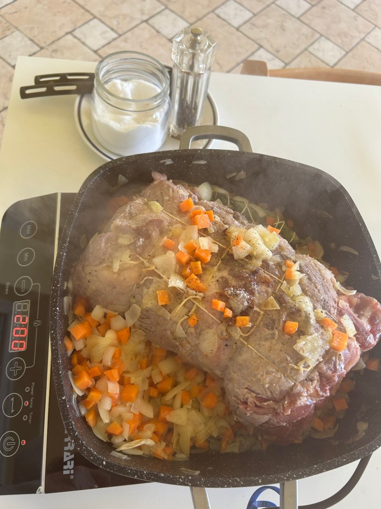 La cottura sarà di circa due ore e mezza, si calcola circa un’ora per chilo di carne, oppure se avete un termometro 80/82 gradi al cuore durante la cottura lo giro spesso e aggiungo del brodo di carne o vegetale, l’arrosto deve rimanere molto umido per poi avere parecchio intingolo