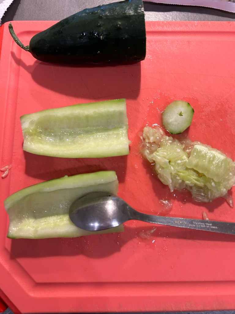 Sbuccio il cetriolo, elimino con un cucchiaino i semi centrali