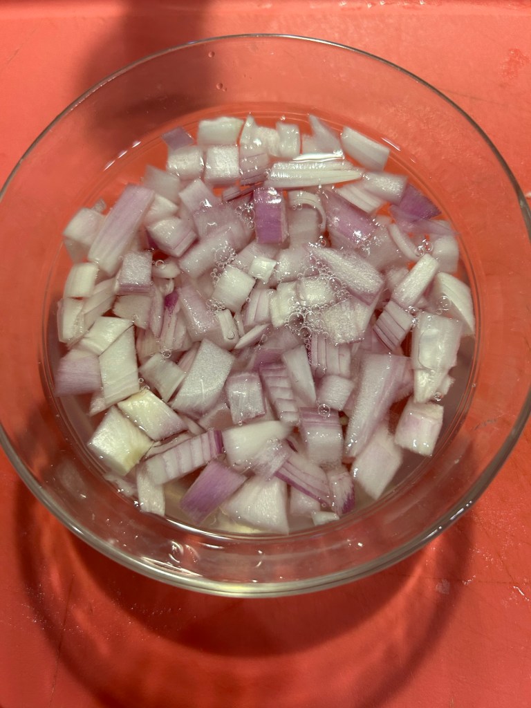 Taglio la cipolla a cubetti e la metto in una ciotola con acqua fredda e un goccio di aceto per togliere il gusto forte