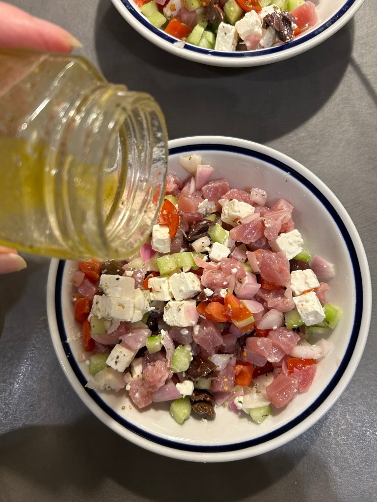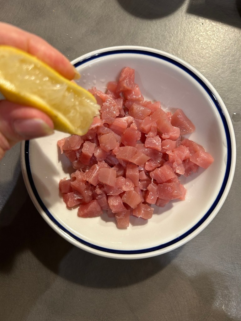 Taglio a cubetti sottili il tonno e spremo sopra qualche goccia di limone