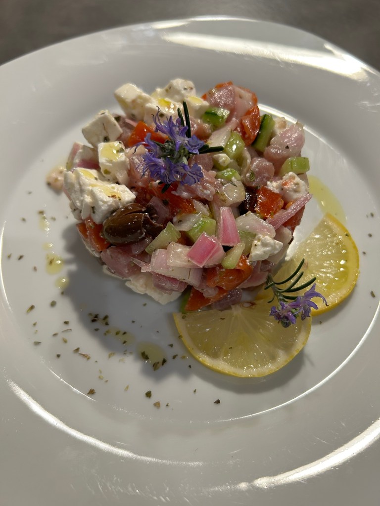 Tolgo il coppa pasta, decoro con fettine di limone e dei fiori di rosmarino, un pizzico di origano e aggiungo ancora un goccio di emulsione e buon appetito