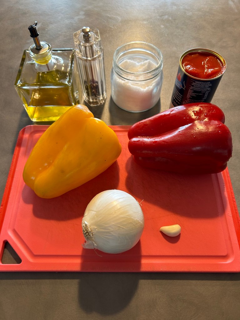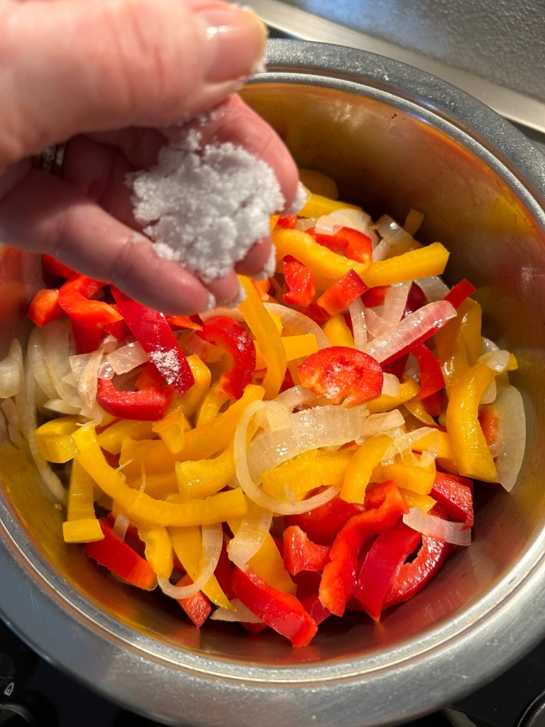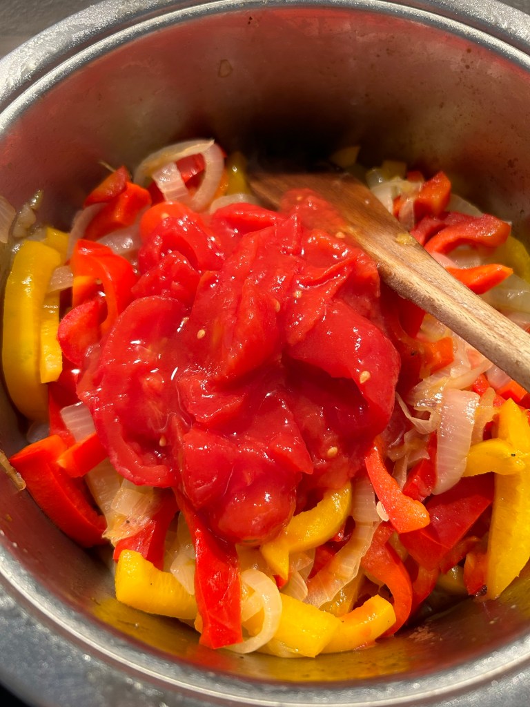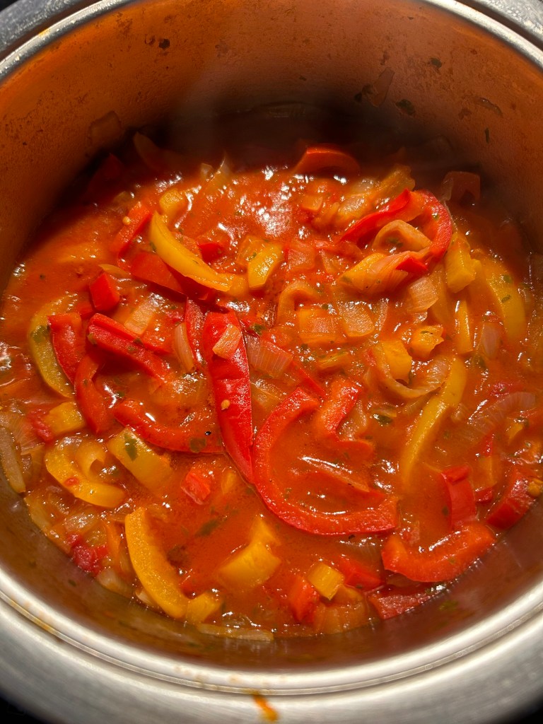 Copro con il coperchio e lascio cuocere per circa mezz’ora finché i peperoni sono cotti, se serve aggiungo un goccio di acqua, ma non troppa la salsa deve rimanere corposa e densa, aggiungo un trito di prezzemolo