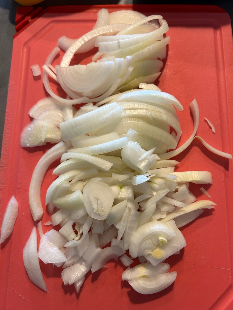 Aggiungo le cipolle e le lascio appassire per 5 minuti mescolando