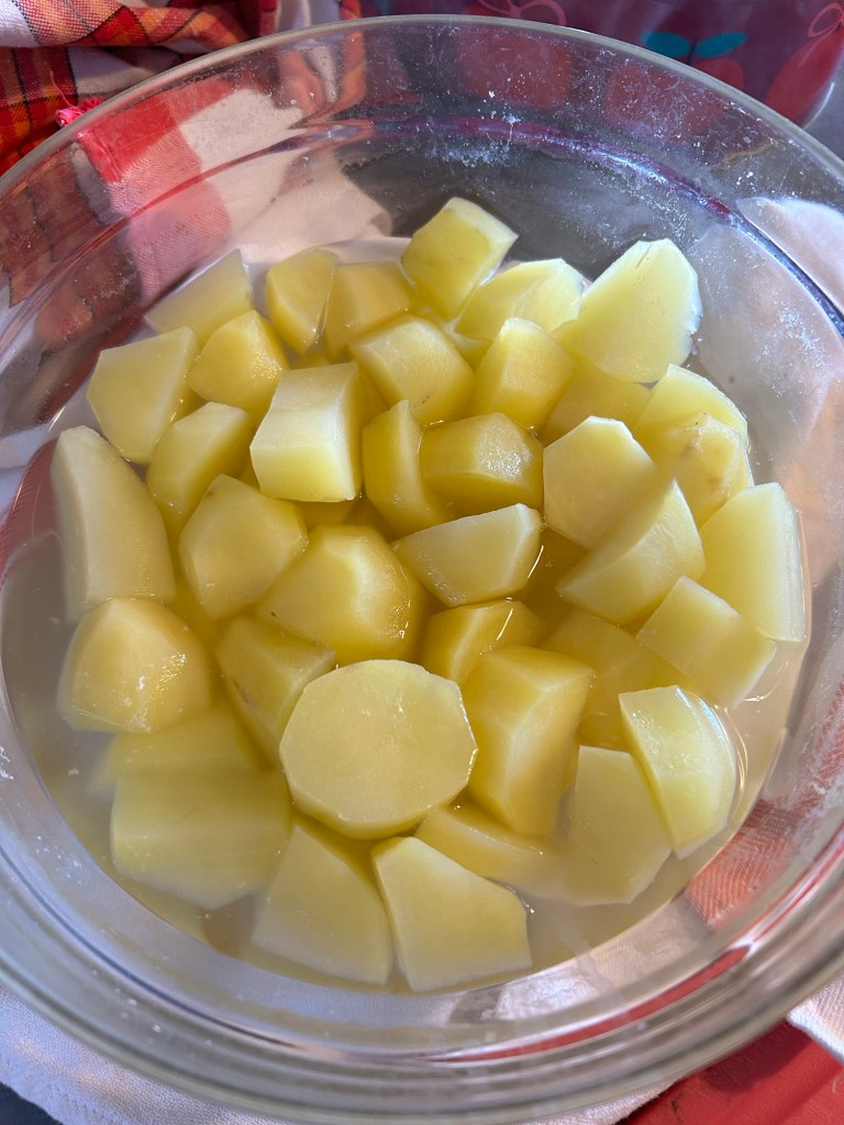 Metto a bollire le patate nella maniera classica oppure per sveltire la cosa le sbuccio, le taglio a pezzi, le metto in una ciotola con poca acqua, poco sale, copro con pellicola adatta al microonde e le cuocio per circa 15 minuti a microonde