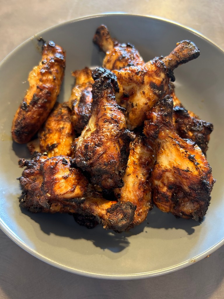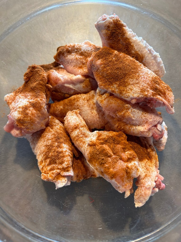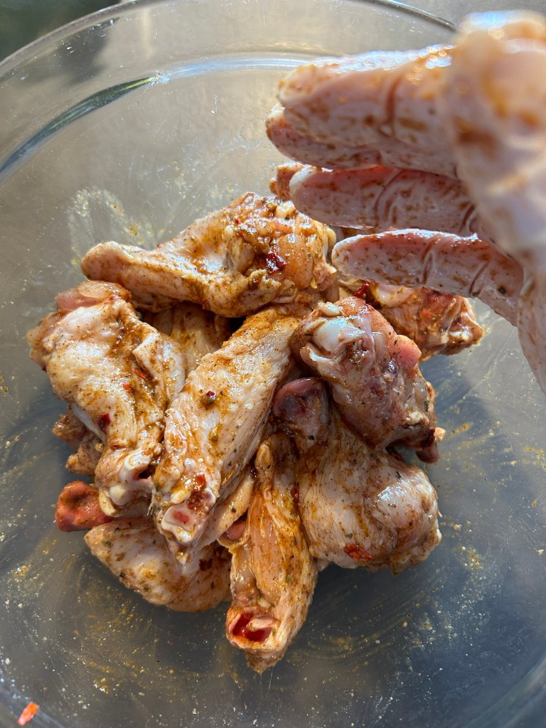 Dispongo il pollo nella friggitrice ad aria, io metto sotto gli appositi contenitori di carta forno, cuocio in modalità ali di pollo a 200 gradi per 25 minuti