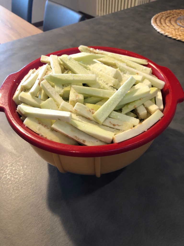 Le taglio a fette di circa 1cm e poi a bastoncino sempre di 1 cm, se sono lunghe le taglio a metà