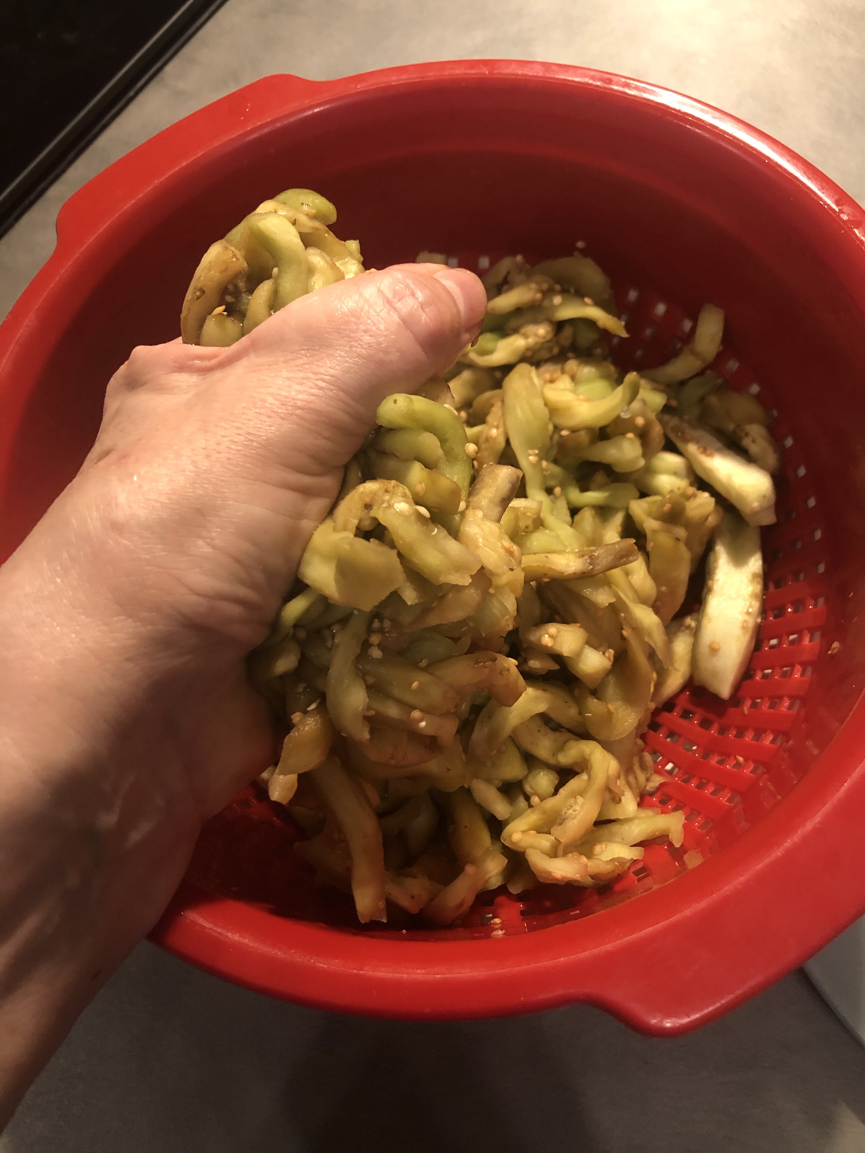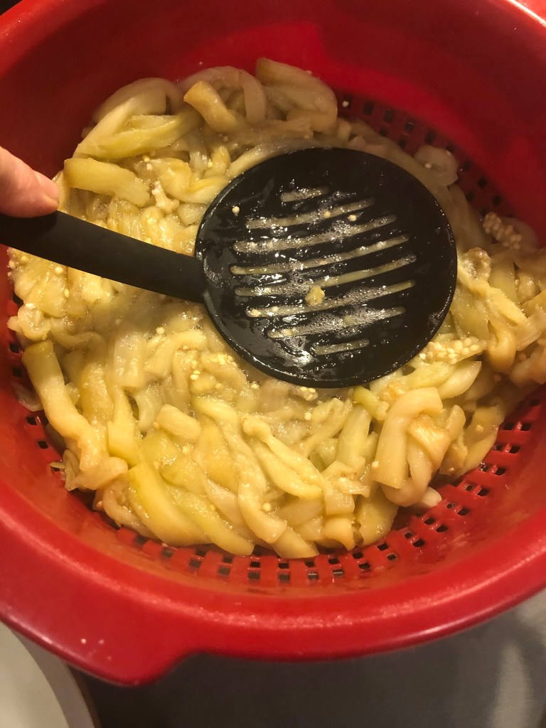 In questo modo rilasceranno il liquido di vegetazione amaro, appoggio sopra un piatto con un peso, se volete ogni tanto giratele, devono essere pressate, le lascio riposareanche tutta la notte