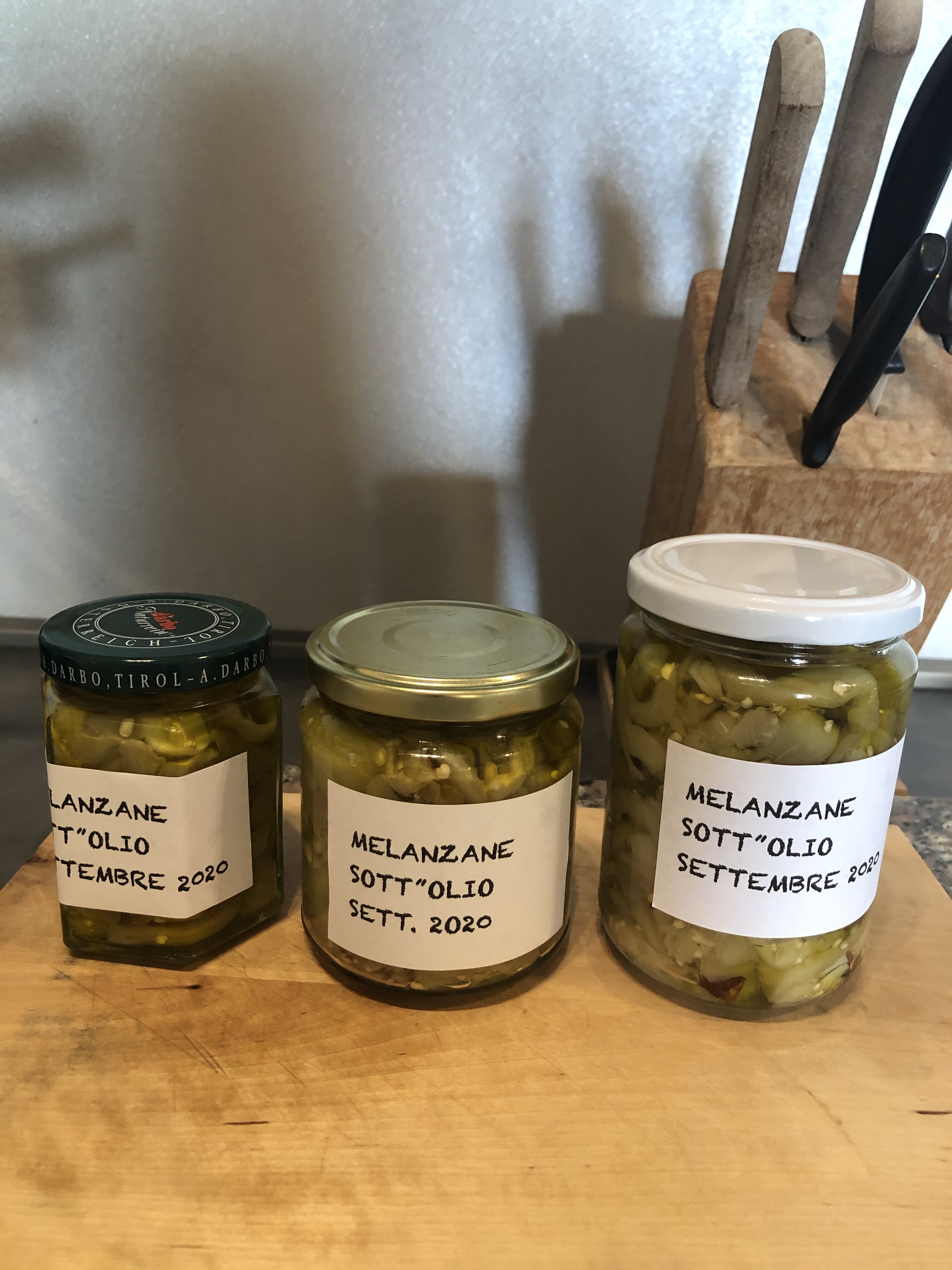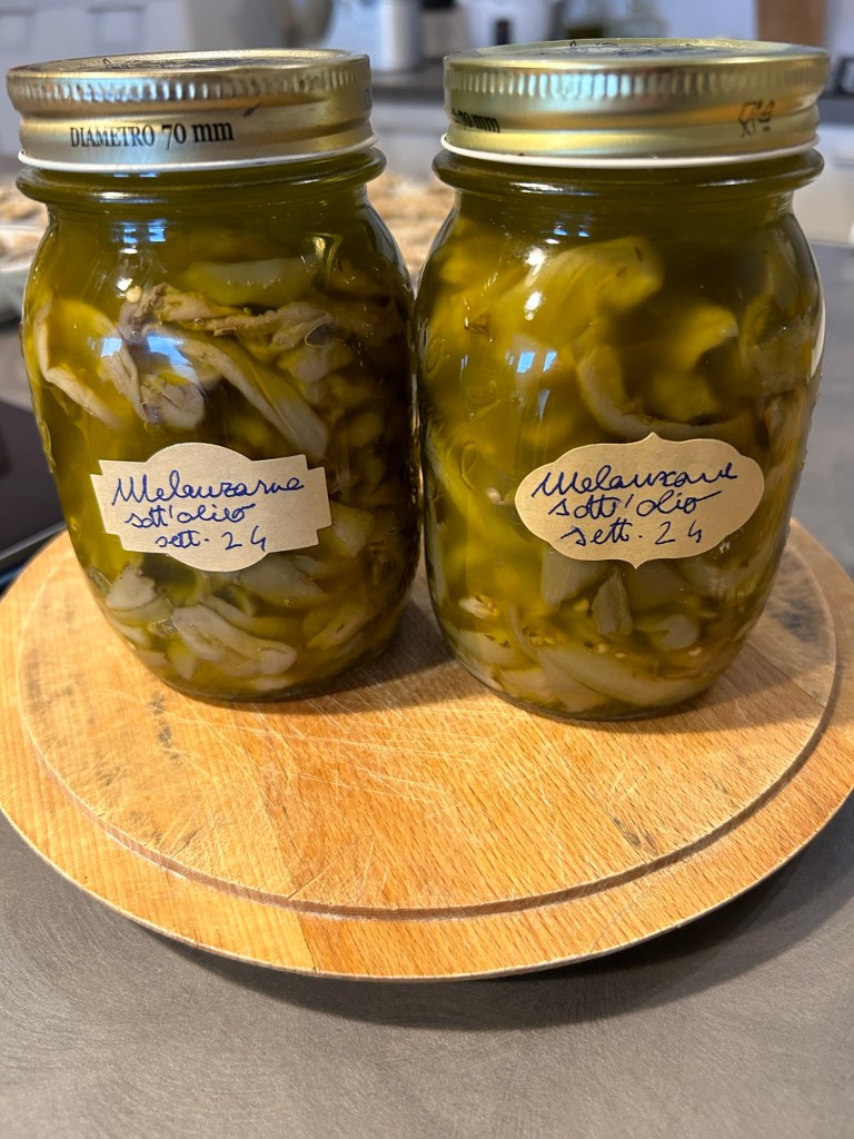 Ricopro con olio extravergine, attendo un po’ prima di chiuderli, controllate muovendo leggermente e con la punta di un coltello per far fuoriuscire tutte le bolle di aria, dopo un po’ controllo e se serve rabbocco con altro olio, quindi tappo i vasetti