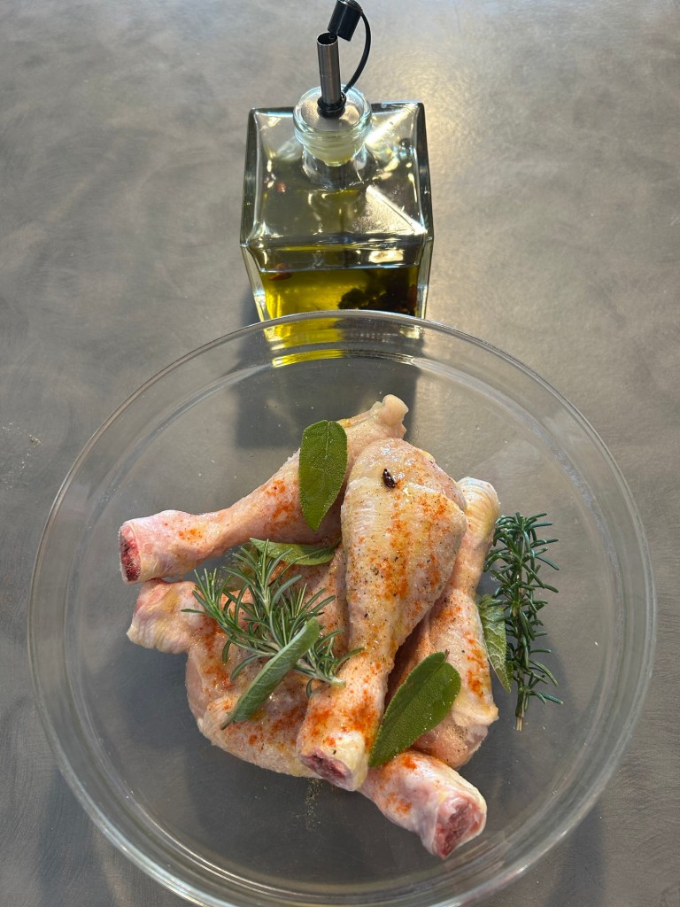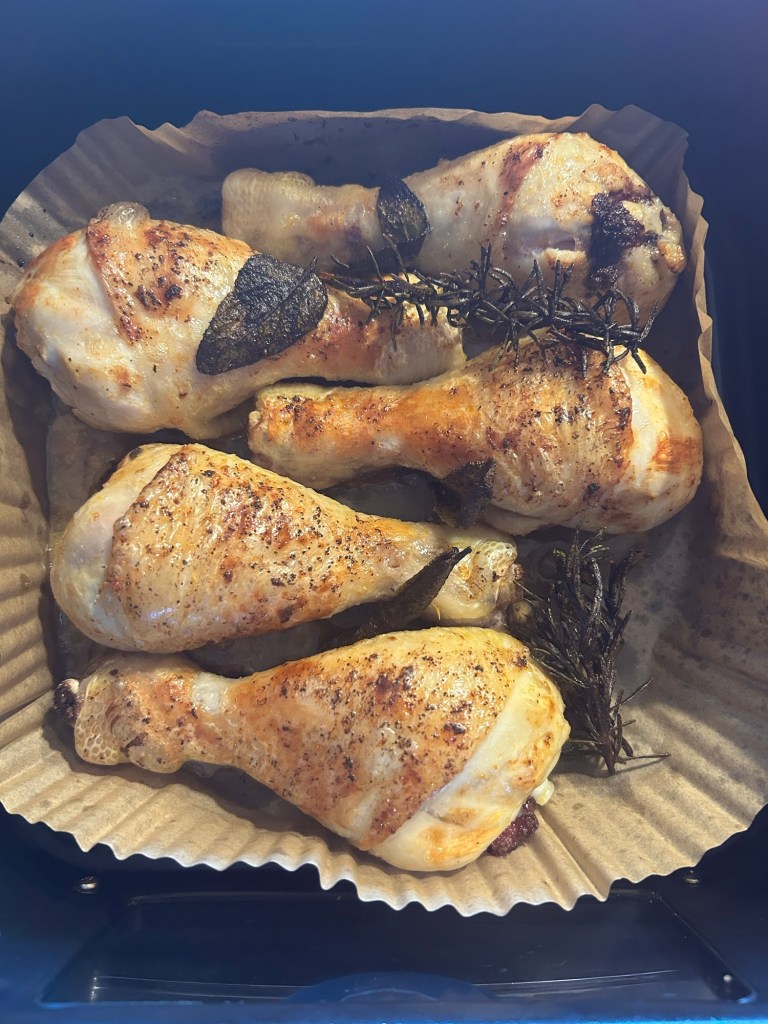 Ottima cottura con la friggitrice ad aria, comoda e rapida, questi fusi di pollo si possono naturalmente cuocere in un forno normale, li ho serviti con verdure grigliate