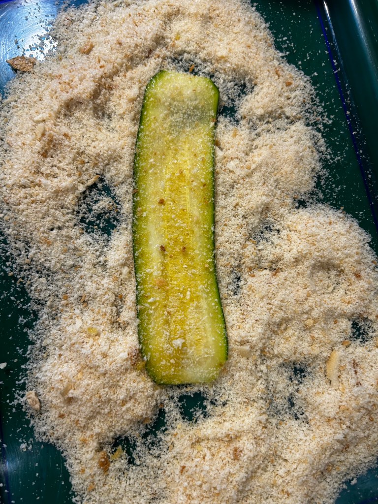 In un piatto verso dell’olio e passo ogni fettina di zucchina