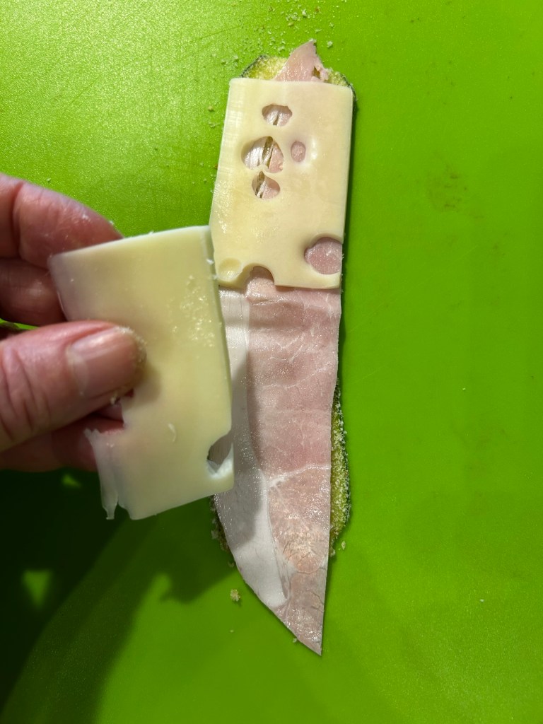 Appoggio una fettina di prosciutto e fettine sottili di formaggio