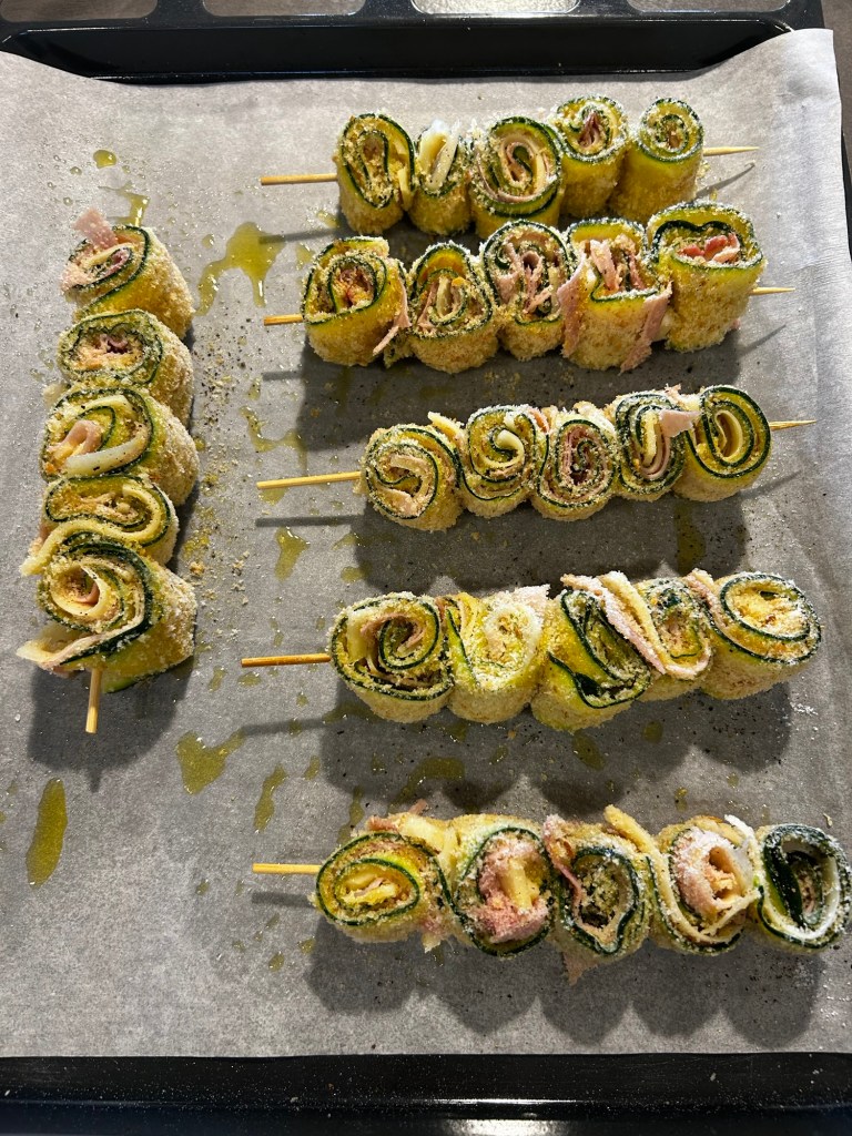 Infilo le girelle sugli spiedini, li appoggio su una placca ricoperta di carta forno unta di olio, spruzzo anche in superficie con olio