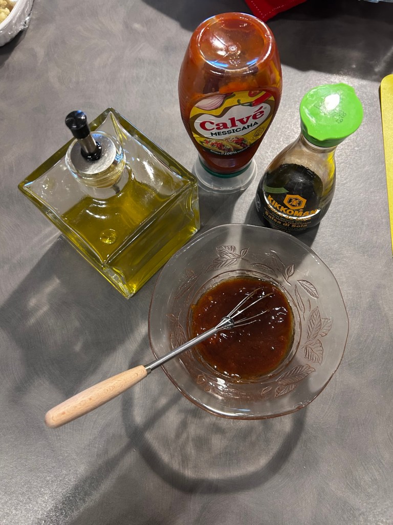 In una ciotola preparo un’emulsione con la salsa messicana, la soia, l’olio