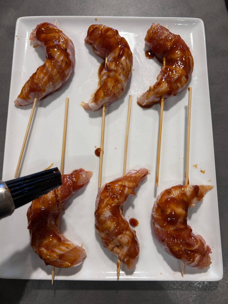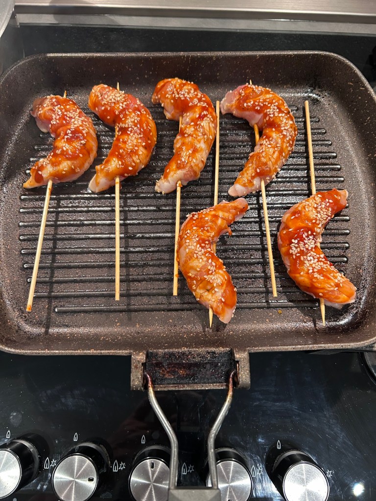 Cospargo con semi di sesamo, scaldo una bistecchiera e cuocio i finti gamberoni