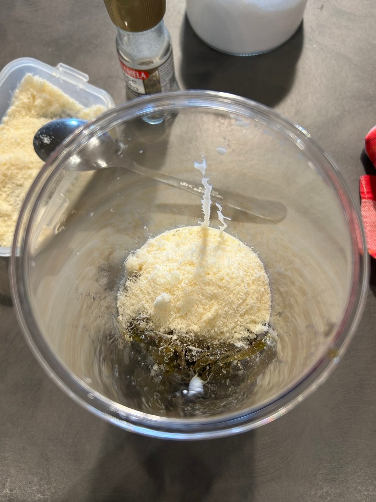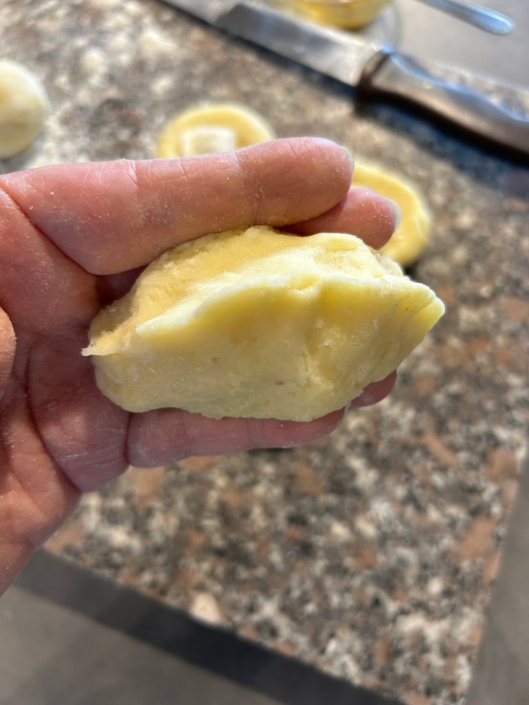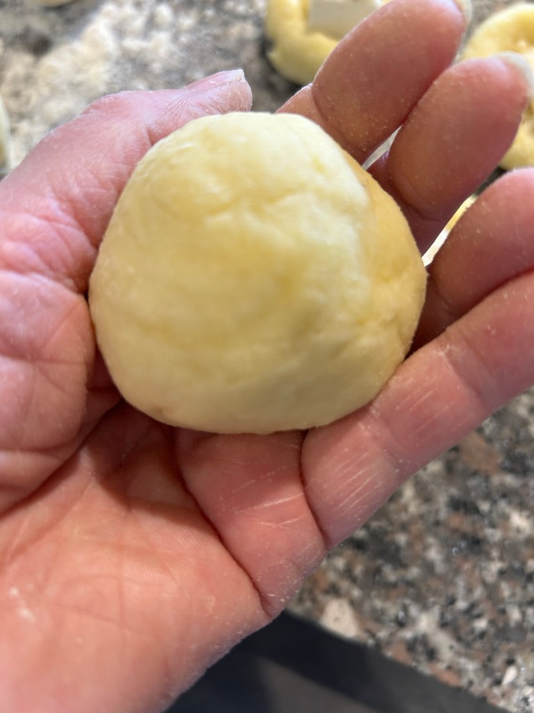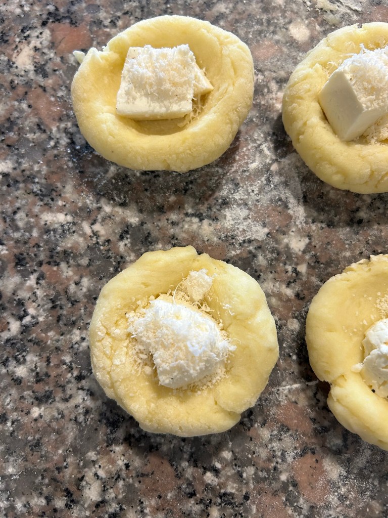 Allargo ogni pallina e creo un incavo al centro e inserisco un cubetto di formaggio e un cucchiaino di grana macinato