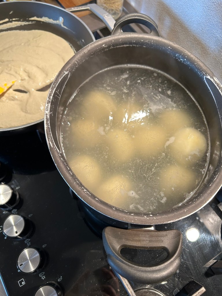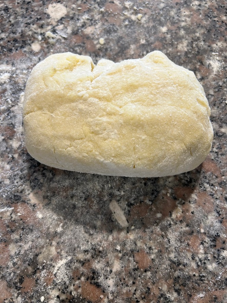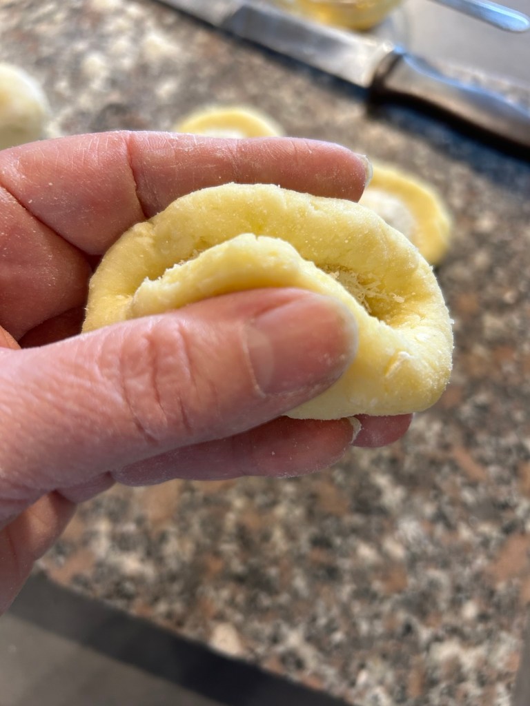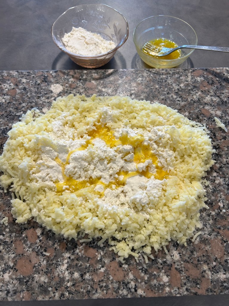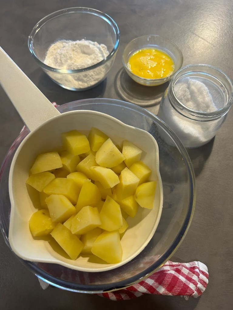 Quando sono ben scolate ma ancora calde le schiaccio con lo schiaccia patate sulla spianatoia infarinata, le lascio quasi raffreddare, in questo modo assorbiranno meno farina, batto l’uovo intero in una ciotola e ne aggiungo metà